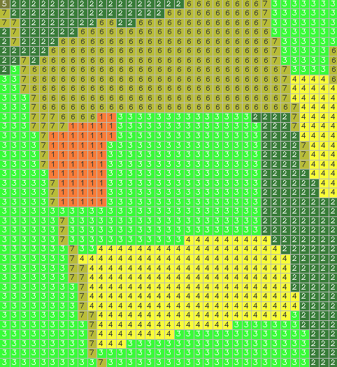 For example, in Figure 1 below we have an image that depicts the region on the battlefield between the Miller Cornfield and the North Woods. A grid is displayed, showing the boundaries of each cell. Inside each cell, we see a value that describes the type of terrain that that cell occupies: